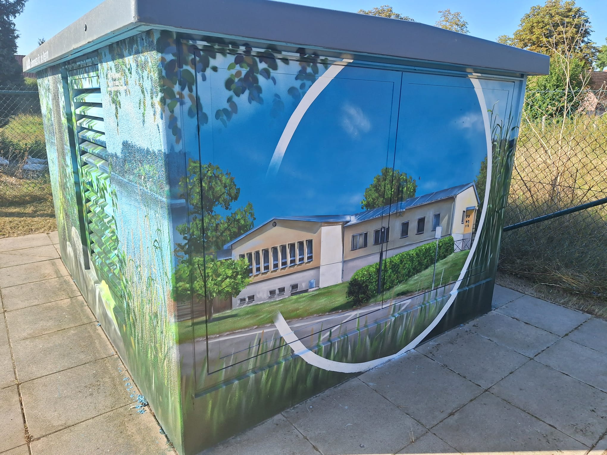 Im August hat sich der Künstler Patrick Kieper daran gemacht, dieses Häuschen mit Graffiti zu gestalten. Auftraggeber ist die e.dis, die seit 20 Jahren in der Region Trafohäuschen gestaltet. Die Motive für das Projekt haben die Gemeindevertreter geliefert, Herr Kieper hat die Vorgaben perfekt umgesetzt. Ein großes Lob an den Künstler. Ich möchte mich bei Herr Klemmer von der e.dis bedanken, der uns dieses Projekt angeboten und mit uns gemeinsam umgesetzt hat, denn die Wartelisten für die Umgestaltung dieser Häuschen ist lang.