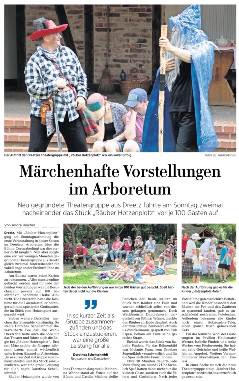 Der Räuber Hotzenplotz stiehlt die Kaffeemaschine der Großmutter, wird aber von zwei mutigen Dreetzer Kindern dingfest gemacht. Das erste Stück des Dreetzer Waldtheaters, das sich im Jahr 2020 neu gegründet hat. Die MAZ berichtete ausführlich.