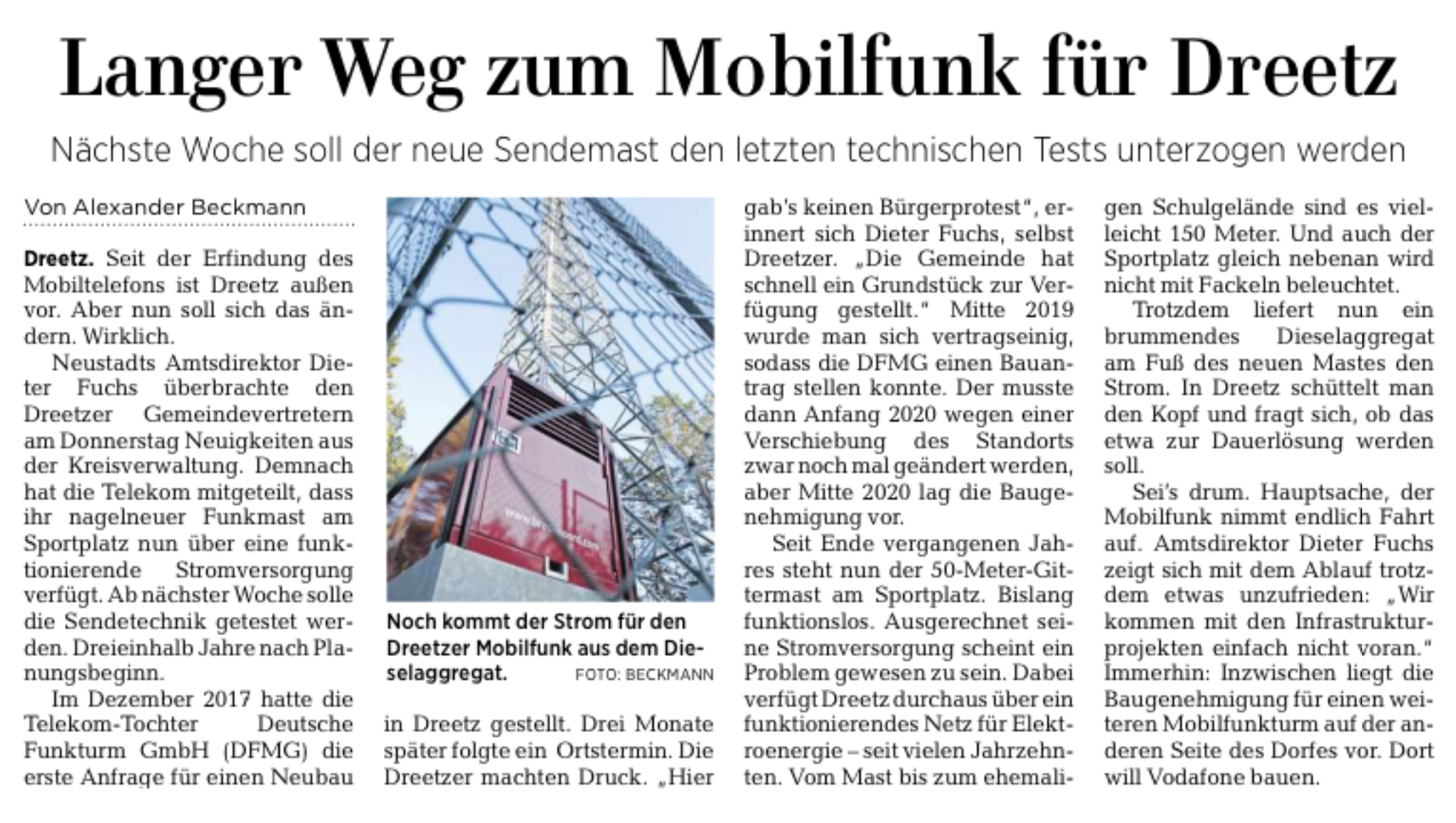 15.09.2021: Dreetzer Mobilfunkmast funktioniert jetzt