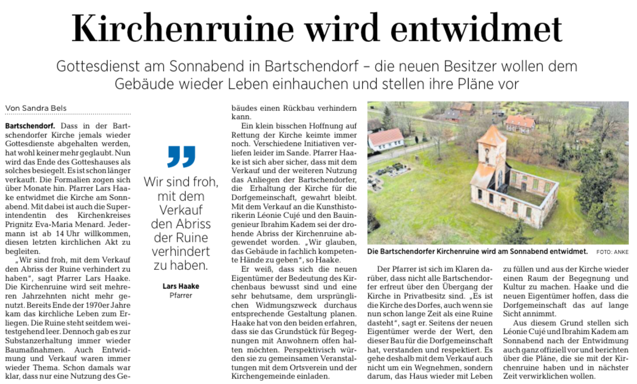 13.08.2021: Kirchenruine Bartschendorf wird entwidmet
