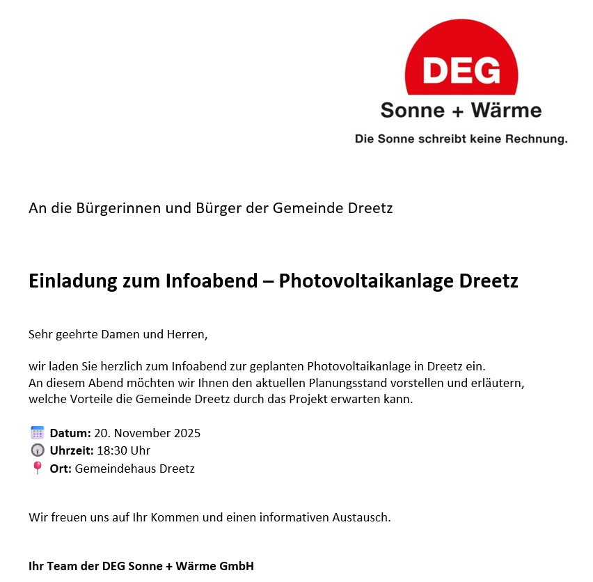 Informationsveranstaltung zur Großflächen-Photovoltaikanlage Dreetz