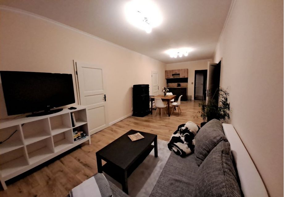 Ein gemütliches Wohnzimmer mit Sitzgelegenheiten und TV